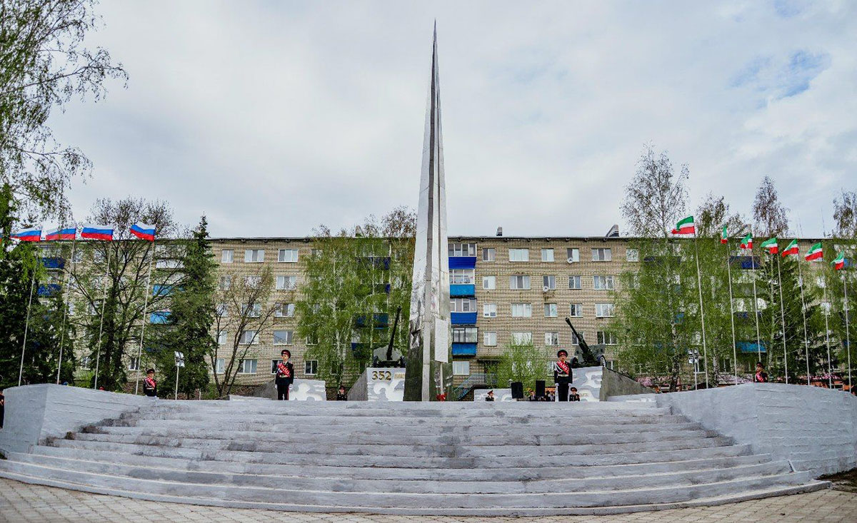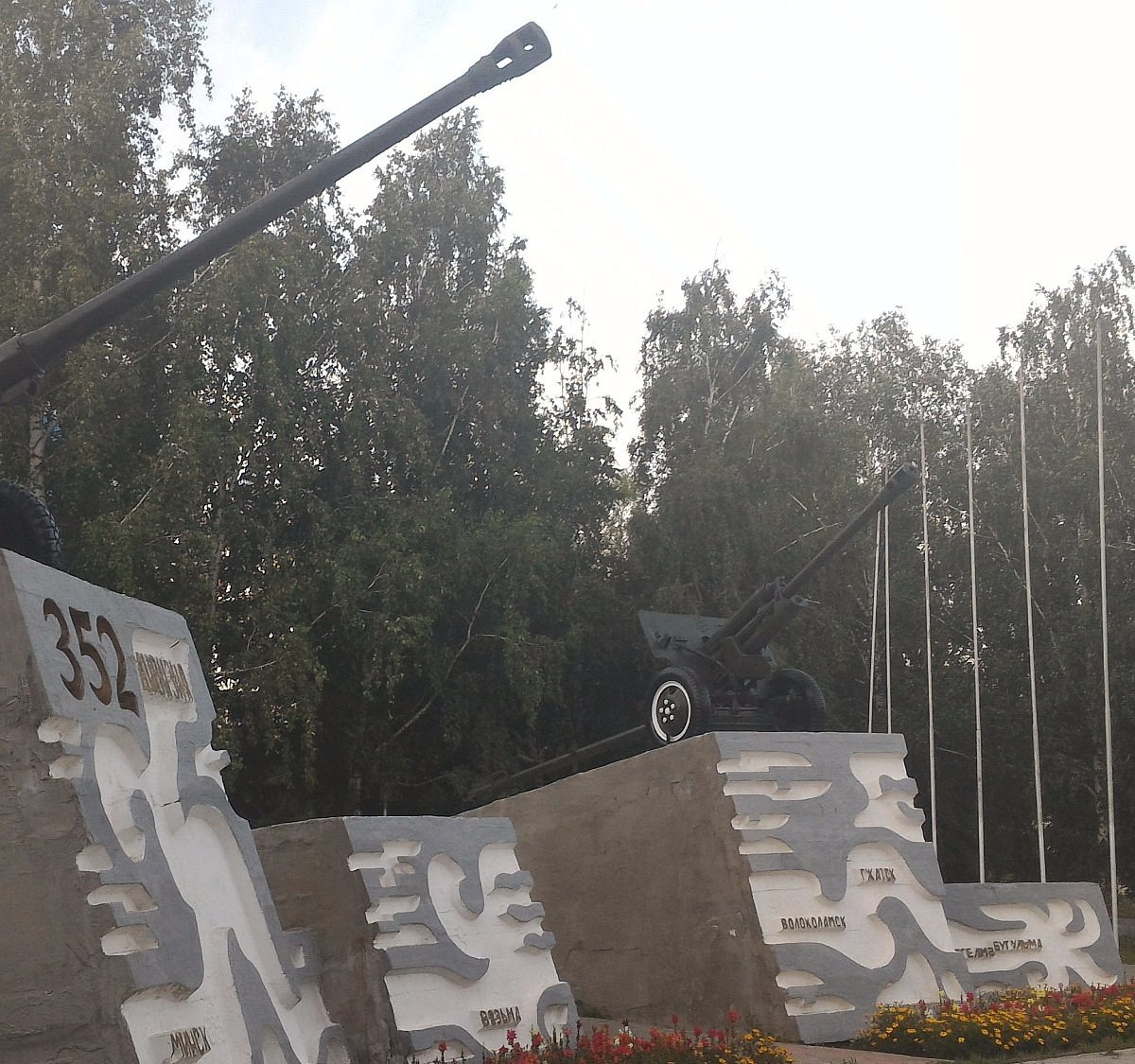 В первые месяцы войны по всей территории СССР была объявлена всеобщая мобилизация, поэтому в Бугульме осенью 1941 года была создана 352-я стрелковая дивизия, основу которой составляли уроженцы Татарстана. Воинами дивизии был пройден славный путь от Москвы до Праги. Звание Оршанской дивизии присвоили за освобождение города Орши, за участие же в освободительной операции белорусского Минска ее наградили орденом Красного знамени. Благодарные жители увековечили воинский подвиг своих земляков, установив в 1983-м году в центре Бугульмы мемориальный комплекс с военной техникой времен Великой отечественной войны и обелиск 352-й Оршанской краснознаменной дивизии. Дивизионная пушка ЗИС-3 калибра 76.2 мм, дивизионная пушка Д-44 калибра 85 мм.